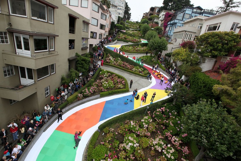 Кстати, саму улицу в 2009 году даже на время превратили в настоящее игровое поле. К 60-летию настольной детской игры CandyLand дорогу раскрасили в разные цвета, добавив Ломбард-стрит еще большей красочности и необычности.