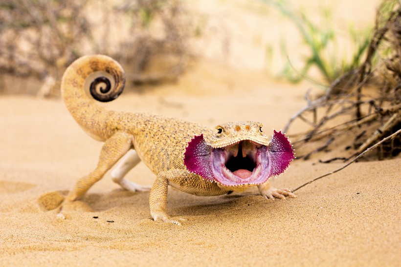 Круглоголовка, или жабоголовая агама, живет в пустыне, общается с сородичами при помощи скручивания хвоста и отпугивает врагов своими причудливыми ротовыми складками.