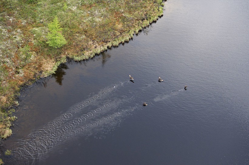 Взлетающие гуси на озере в тундре. Таймырский полуостров. Красноярский край