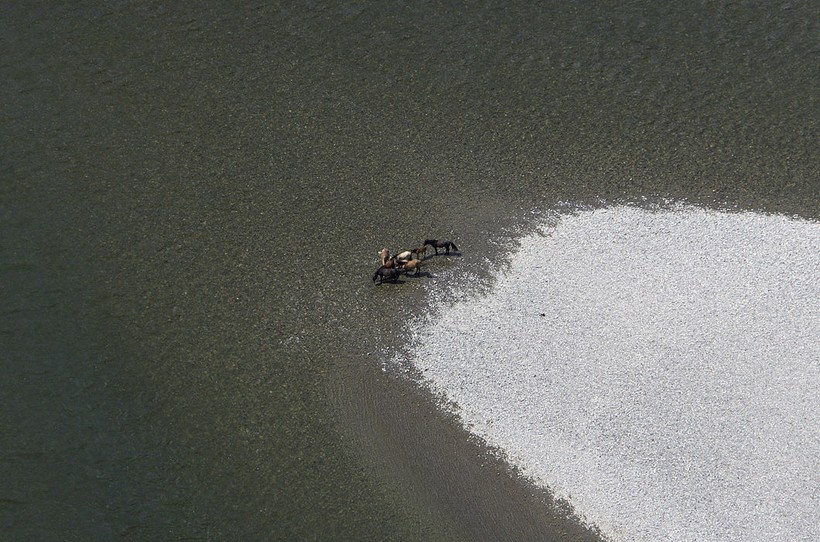 Кони на водопое на берегу Телецкого озера. Горный Алтай