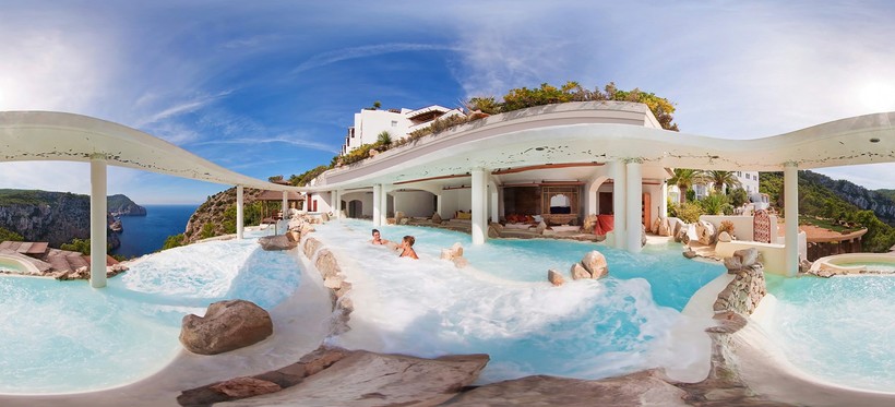 Отель Hacienda Na Xamena — один из самых роскошных и популярных на Ибице. И одна из причин, почему его любят путешественники, — это каскад термальных бассейнов и джакузи. Находится все это великолепие на высоте 180 метров над уровнем моря, откуда открываются потрясающие виды. Добавьте ко всему этому горный воздух, пропитанный хвойными сосновыми ароматами, ну чем не сказка?