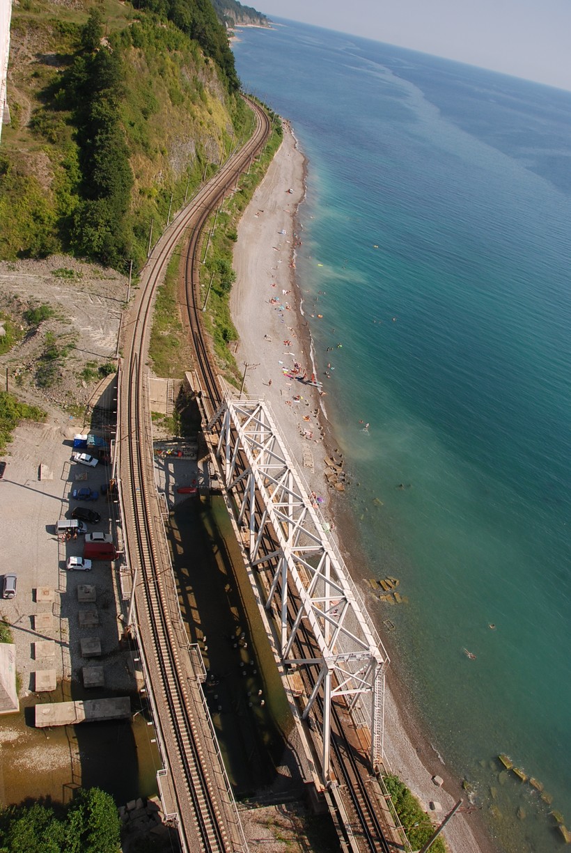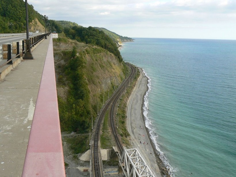 Мост получился достаточно красивый, а виды с высоты поражают воображение: открываются панорамы на бескрайнее Черное море, которое на горизонте сливается с небом, извилистый берег и горы, а также само ущелье, покрытое лесом. Ну а от одного взгляда вниз холодеет все внутри: галечный пляж с крохотными отдыхающими и железная дорога, точно игрушечная, по которой идут маленькие поезда с вагончиками.
