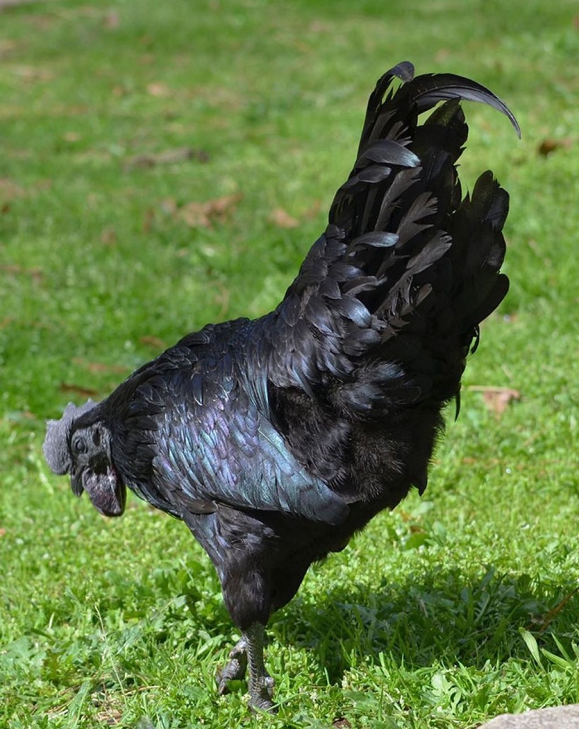 Каждая часть этой уникальной курицы — черная, начиная с металлически черного оперения и заканчивая ониксово-черными лапами. Даже ее внутренние органы угольно черные! Такой эффект вызван состоянием под названием фибрамеланозис — безвредной генетической мутацией, которая вызывает проникновение дополнительного меланина в ткани органов птицы. Процесс этот происходит еще в эмбрионе. Порода существует с 12 века и ранее считалась исключительно элитной.