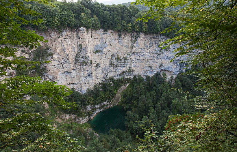 Еще один живописный брат этих водоемов — Сухое озеро. Оно находится в настоящем карстовом колодце глубиной 180 метров. И на дне этой шахты расположен водоем, площадь которого 2500 квадратных метров. Как гласит легенда, когда-то весь этот природный колодец был заполнен чистейшей водой. Но однажды горы содрогнулись, а Сухое озеро утекло, оставив воду только на дне каньона.