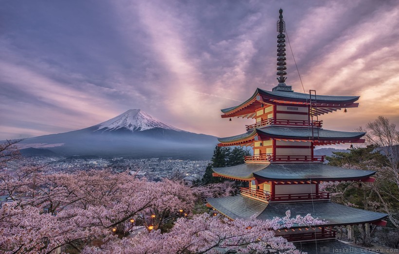 Вулкан Фудзияма — это самая высокая точка Японии. Конечно, гору видно далеко не всегда, но, когда пагода в весеннем цвете сакуры или в осенних красках, тут просто невероятно. А встреча рассвета или заката рядом с этим храмом запомнится надолго.