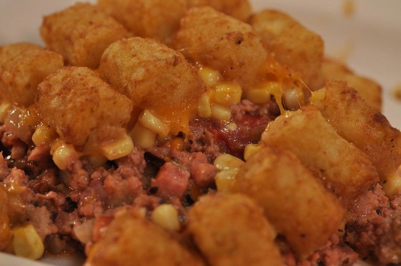 Tater tot casserole готовится из говяжьего фарша, картошки, грибного и куриного крем-супа, а также сгущенного молока.