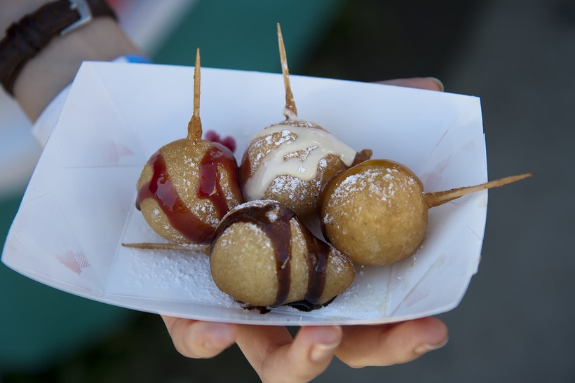 Жареное масло во фритюре: кусочки масла покрывают медом, мукой и корицей и помещают их в кипящий фритюр.