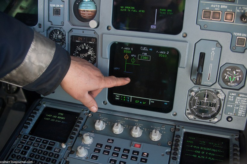 Видимо, так положено по инструкции, но борт запитан не с земли, а от собственной вспомогательной силовой установки. Вот тут на дисплее мне показывают, из какого бака, каким насосом и через какие вентили идет топливо к ВСУ. Также можно узнать, что в крайнем полете борт скушал 3510 кг керосина, а в баках еще осталось 2380, температура топлива +4, а его плотность 0.7.