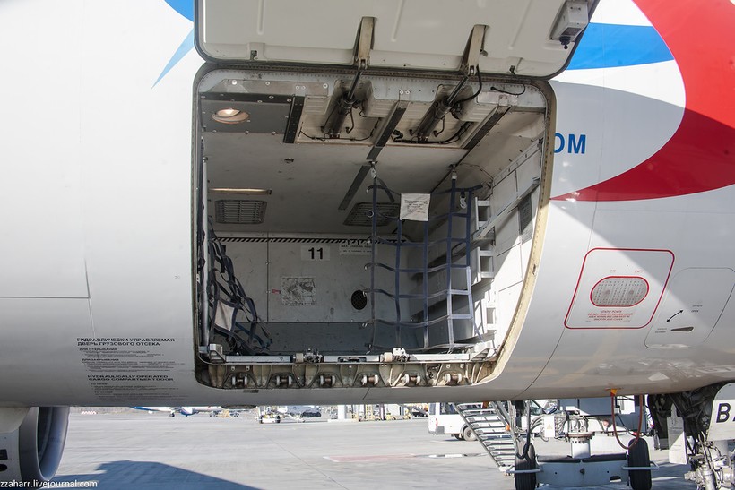 По другую сторону крыла автолифт грузит бортпитание, напитки, журналы, пледы и подушки.