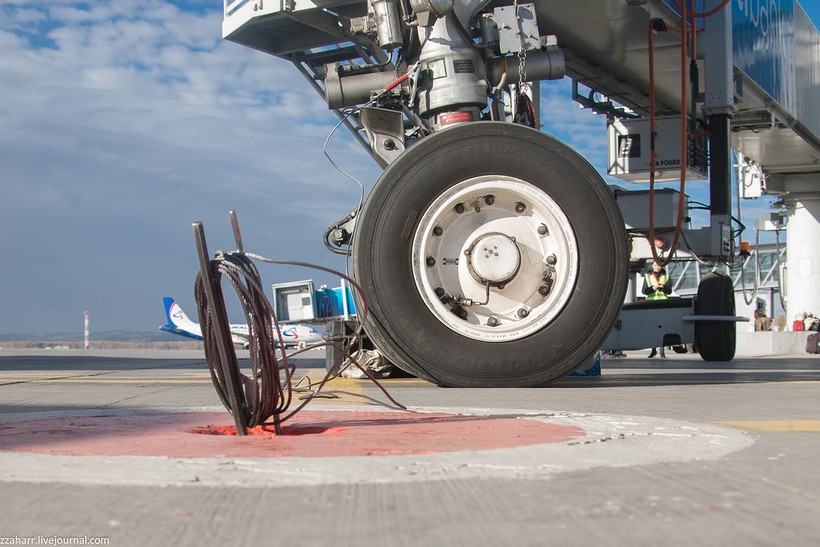 Как только борт причаливает на стоянку, его тут же заземляют. Вот для чего нужны эти красные мишени на бетоне.