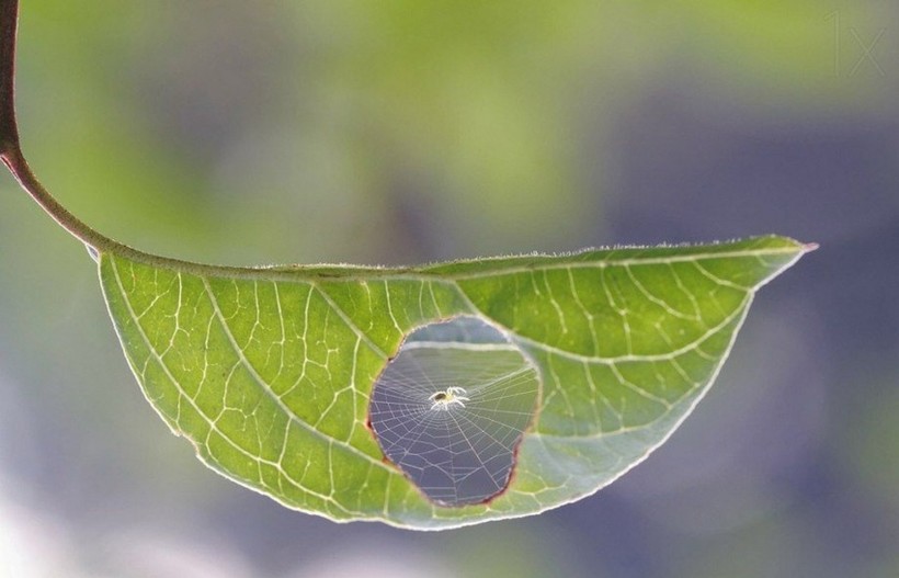 Паук сплел паутинку в листке