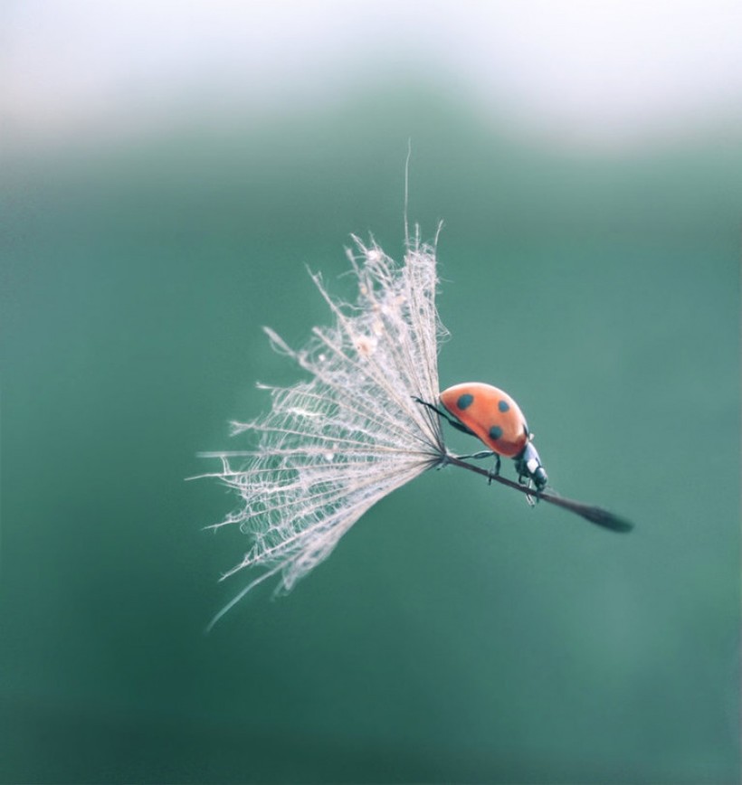Божья коровка, летящая на семени одуванчика