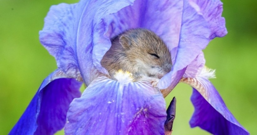 Мышонок полевки, уснувший в ирисе