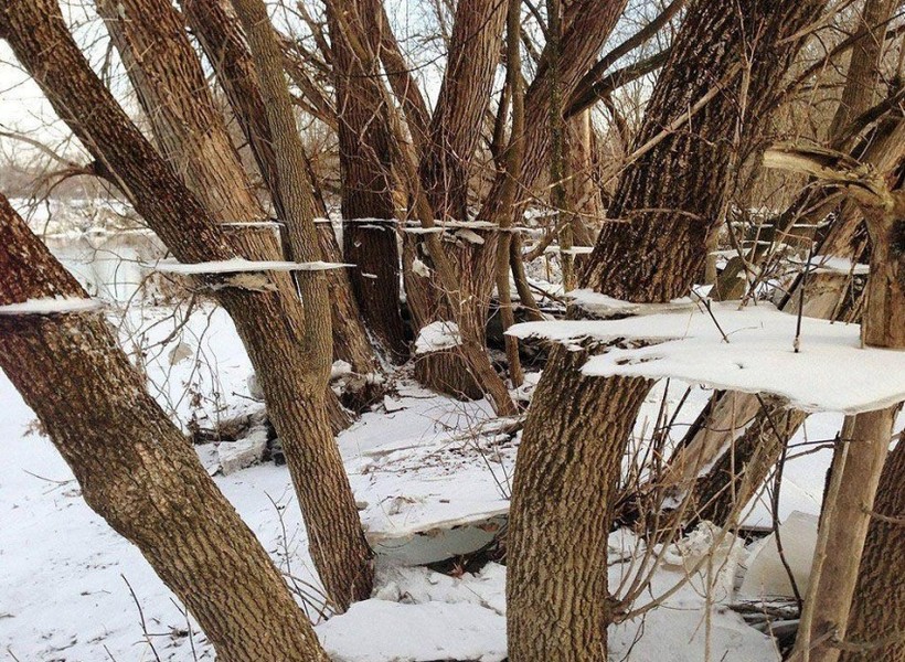 Замерзший снег, оставшийся на деревьях после наводнения