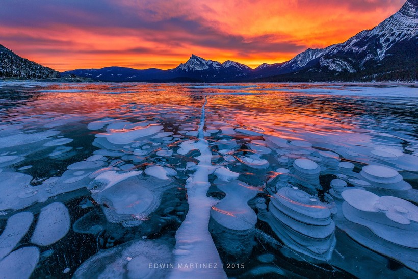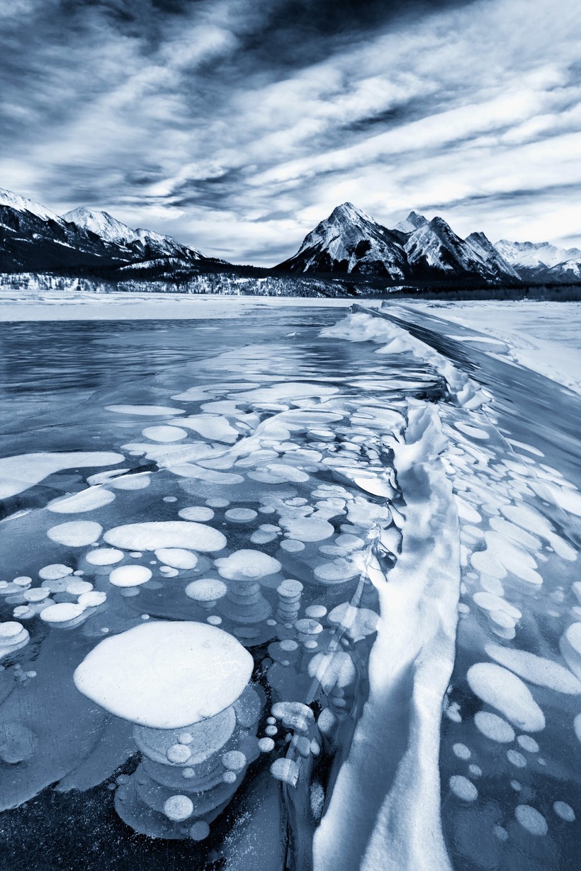 Этот водоем на самом деле искусственный, появился он после строительства плотины на реке Норт-Саскачеван. Но вся необычность Эйбрахама проявляется зимой. Дело в том, что в нем замерзают пузырьки, которые образуют удивительные картины.