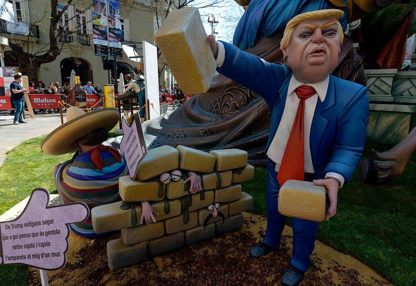 Здесь президент Трамп изображен якобы строящим стену с Мексикой.