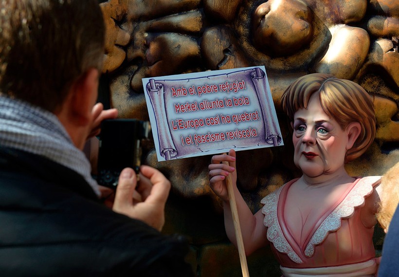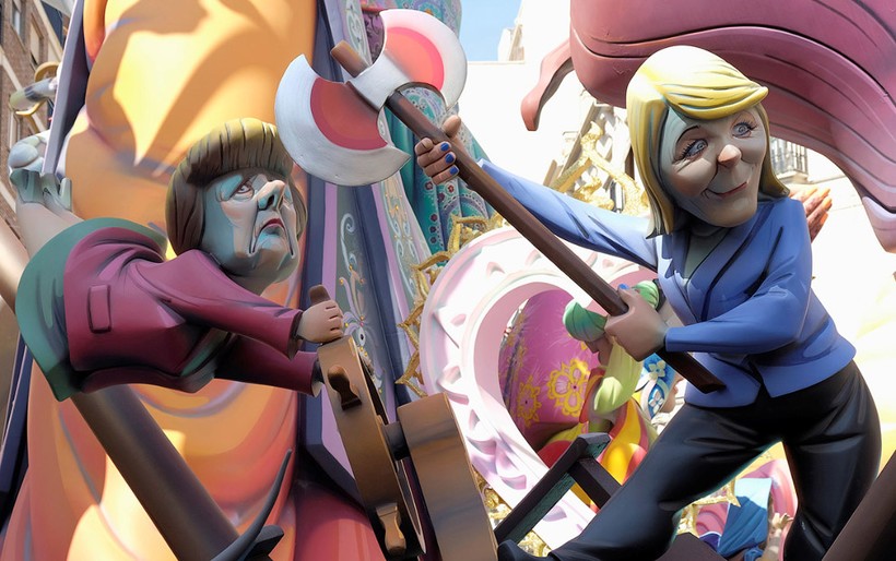 Здесь же можно было встретить изображение Ангелы Меркель, а рядом с ней — французская политик Марин Ле Пен.