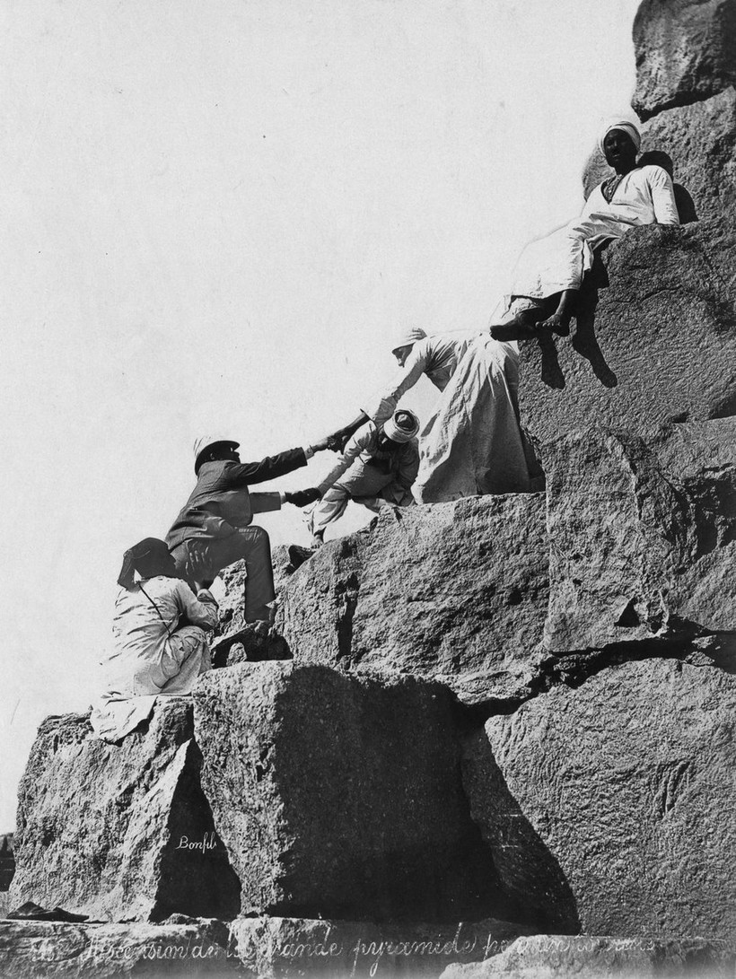 И хотя большинство путешественников довольствовалось лишь снимками на фоне великих пирамид, находились и те, кто отважился взобраться на вершину. Только представьте туристов в длинных платьях и элегантных костюмах, которые взбираются почти на 140-метровую пирамиду Хеопса!