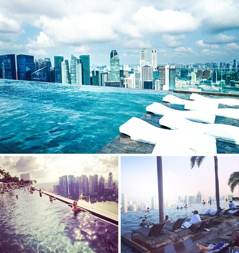 Бассейн отеля Marina Bay Sands — самый большой бассейн на крыше. Он находится на 55-м этаже — на террасе, которая объединяет три 200-метровые башни отеля. Бассейн расположен под открытым небом, у него нет видимых бортиков, из-за чего создается впечатление, что кромка воды просто обрывается на самой высоте.