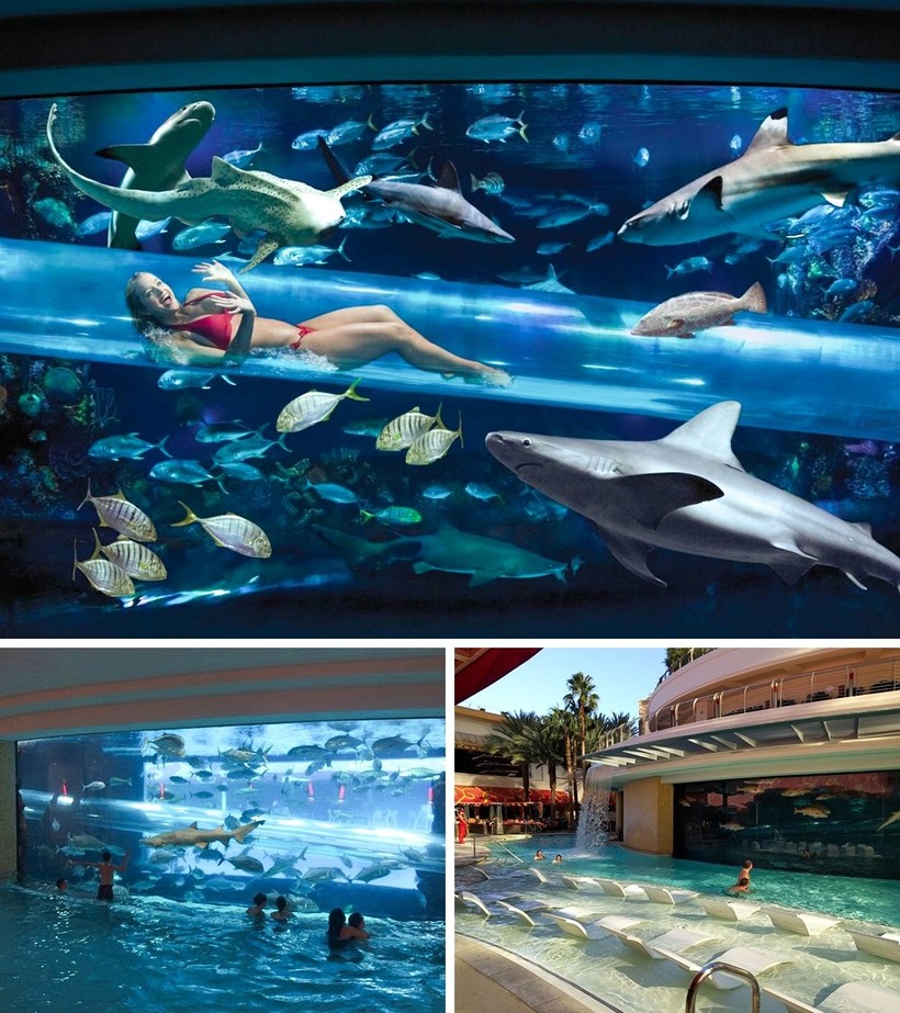 В бассейне казино Golden Nugget в Лас-Вегасе можно поплавать рядом с 16 видами акул. Трехуровневая горка проходит через огромный аквариум с этими хищниками. Строительство бассейна обошлось в $ 30 млн.