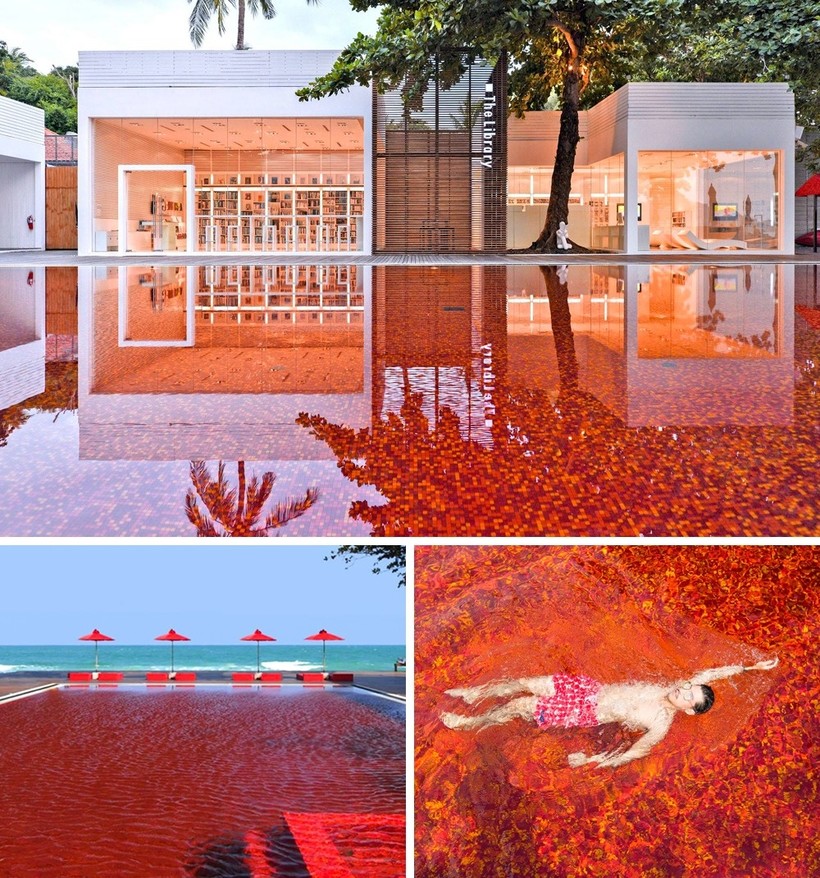 Отель The Library, известный своей богатой библиотекой, прославился еще и благодаря бассейну красного цвета. Красная вода — иллюзия, которая достигается за счет цвета кафельной плитки в бассейне.