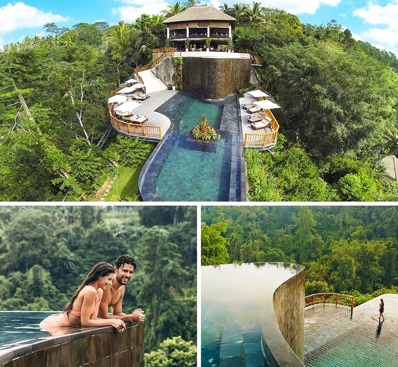 Открытый бассейн отеля Hanging Gardens на Бали находится прямо в джунглях. Его плавные формы выглядят так, будто их создала сама природа. Тут можно поплавать, наслаждаясь пением экзотических птиц.