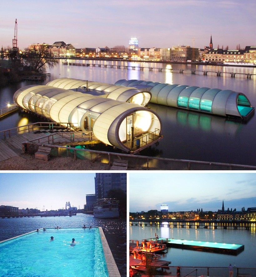 Плавающий бассейн Badeschiff позволяет жителям Берлина отдыхать на берегу реки Шпрее и купаться. Сама река для этого слишком грязная. Бассейн переоборудовали из старой баржи. Зимой на него надевают съемную крышу.