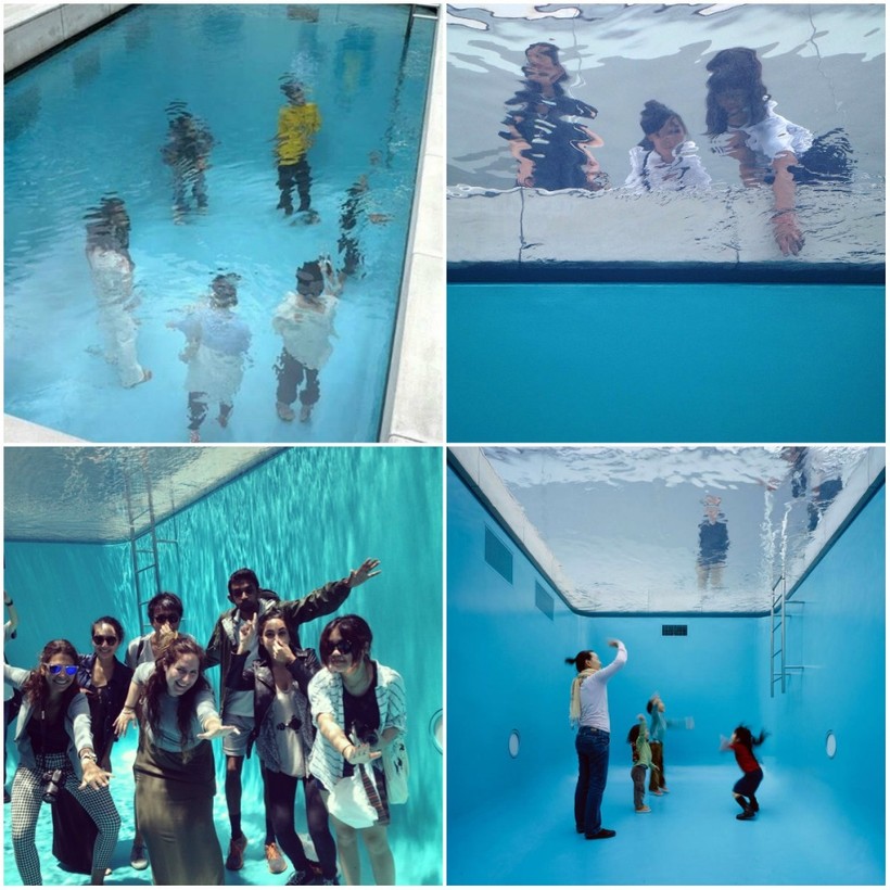 Инсталляция художника Леонардо Эрлиха под названием Swimming Pool поражает воображение — кажется, что это обыкновенный бассейн, наполненный голубой мерцающей водой. В действительности ее слой составляет всего несколько сантиметров, а внутренность бассейна пуста, и в нее может зайти любой желающий.