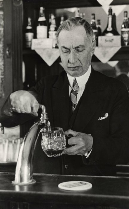 Самый известный в России комический актер оперетты Александр Полонский, в эмиграции работающий за барной стойкой в небольшом русском кафе в Берлине. Германия, 1930 год.