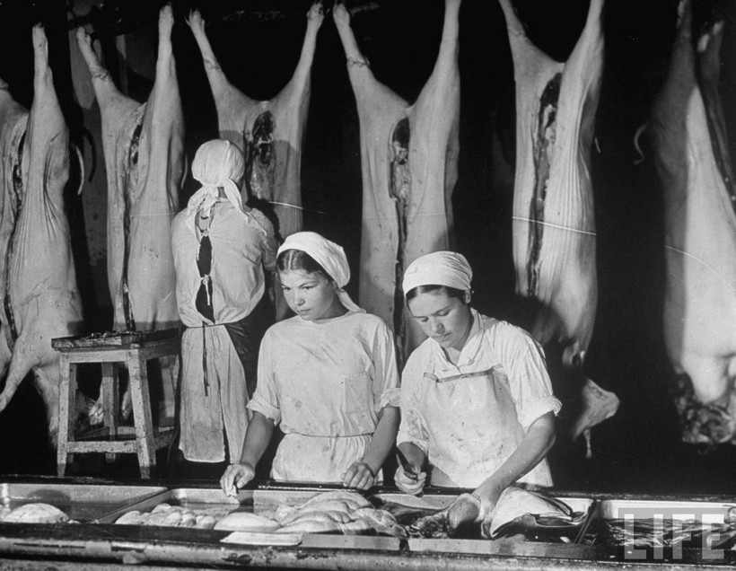 Работницы Микояновского мясокомбината на разделке мяса. СССР, Москва, август 1941 года.