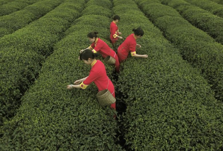 Девушки народа цян заняты сбором чайных листьев на плантации в Яане, провинция Сычуань.