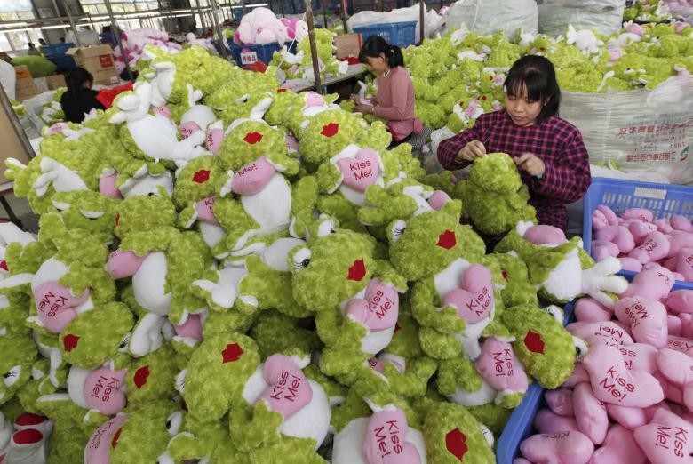 Еще одна игрушечная фабрика: работницы пришивают к мягким игрушкам сердечки. Ляньюньган, провинция Цзянсу.
