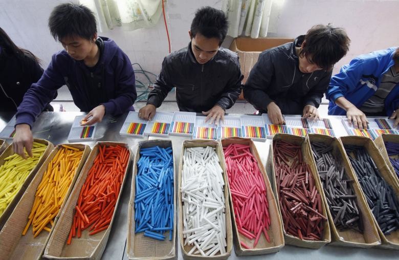 Мужчины фасуют цветные мелки в коробки на фабрике детских игрушек в Дунгуане, провинция Гуандун.
