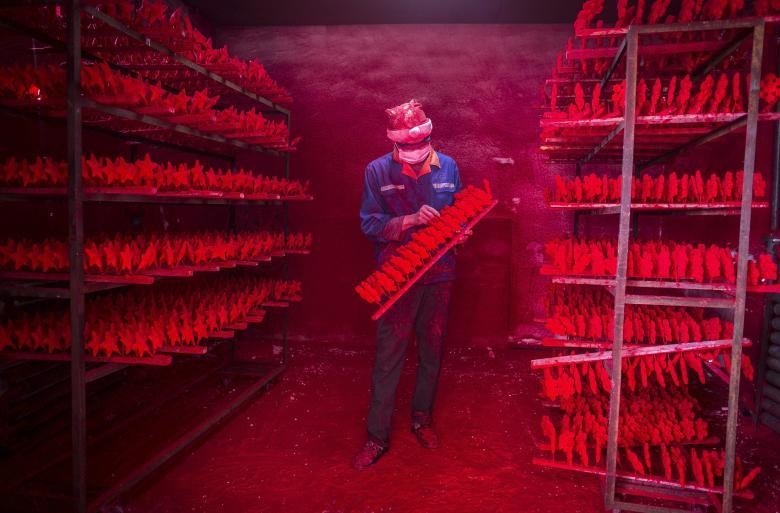 Фабрика в провинции Фуцзянь, занимающаяся изготовлением керамических изделий. Эта работница вручную раскрашивает копилки.