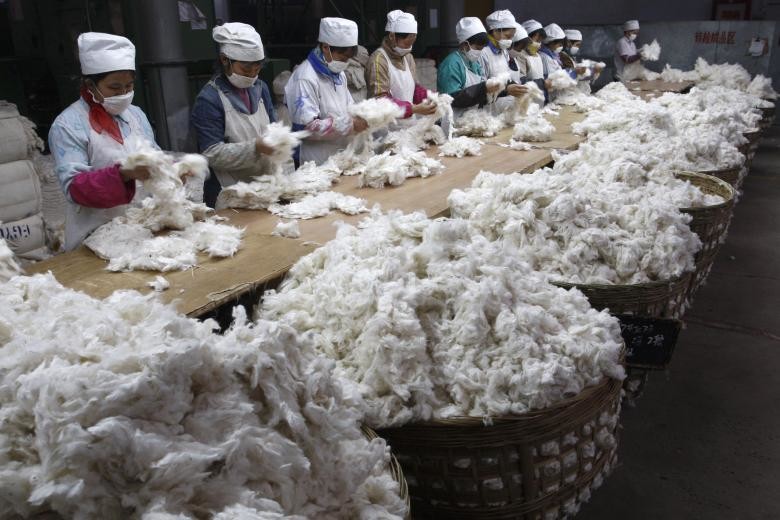Женщины заняты сортировкой хлопка на текстильной фабрике. Город Суйнин, Сычуань.