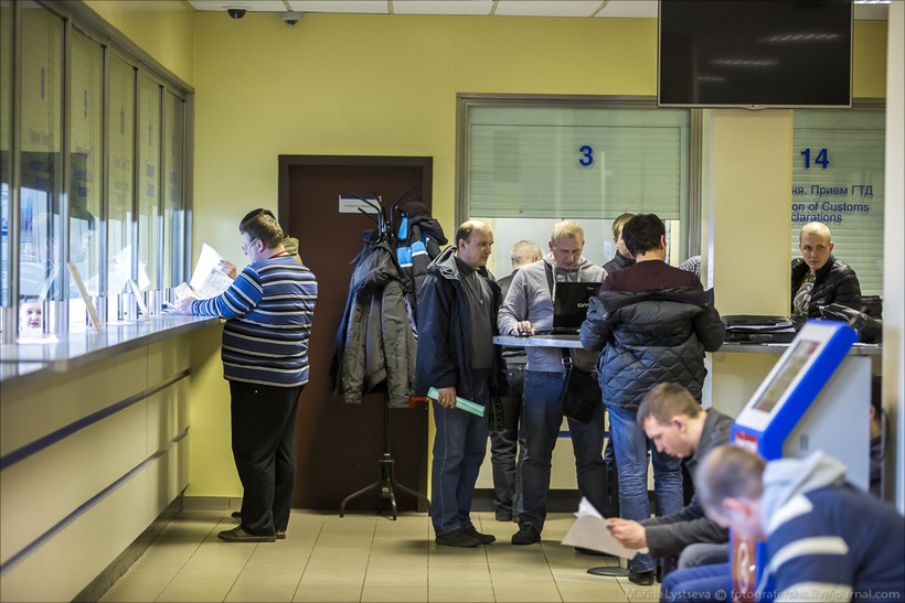 Пока таможня проверяет груз, получатели и отправители занимаются оформлением документов в соседнем помещении.