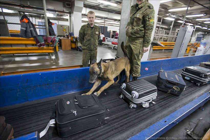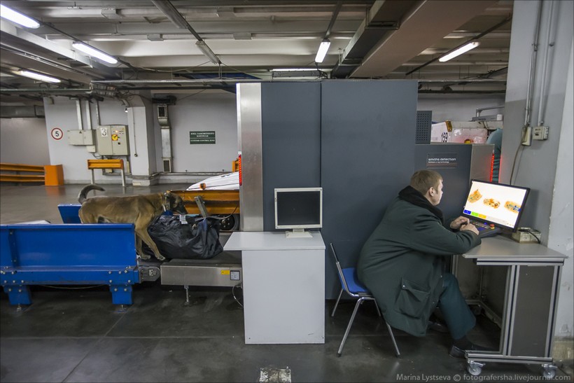 Спускаемся в багажное отделение. Абсолютно все прибывающие чемоданы проходят проверку рентгеном и собакой.