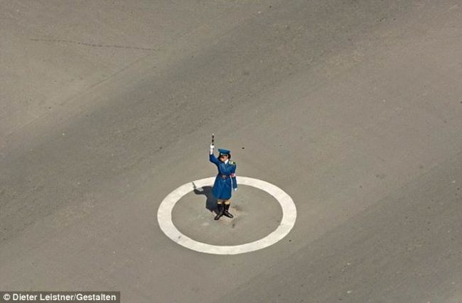 Полицейский, регулирующий движение, стоит в центре проезжей части на пустой дороге в Северной Корее