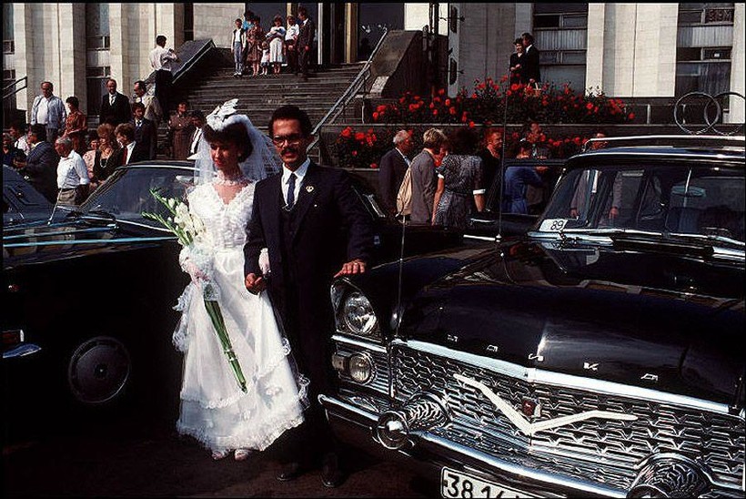 Молодожены у Центрального дворца бракосочетаний. УССР, Киев, 1988 год.