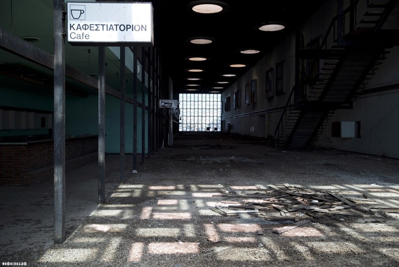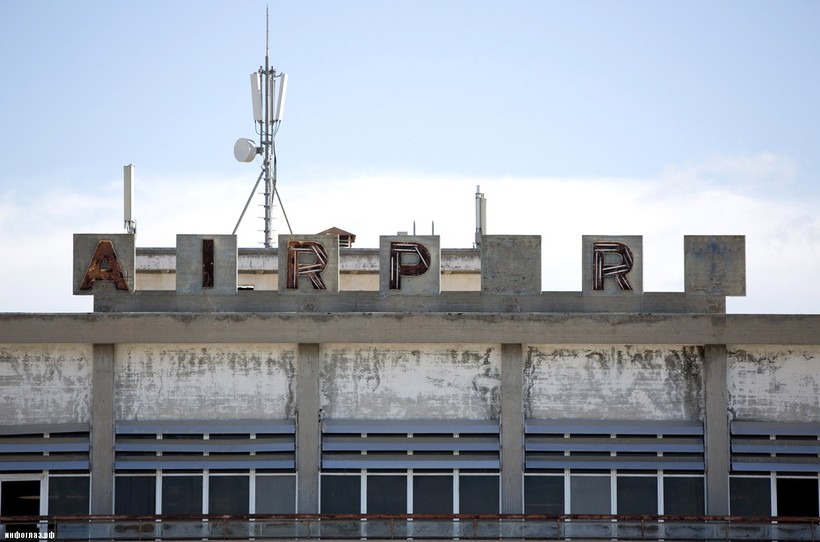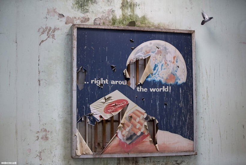 Рекламные плакаты в аэропорту, которые за эти годы обветшали. По аэропорту свободно летают голуби:
