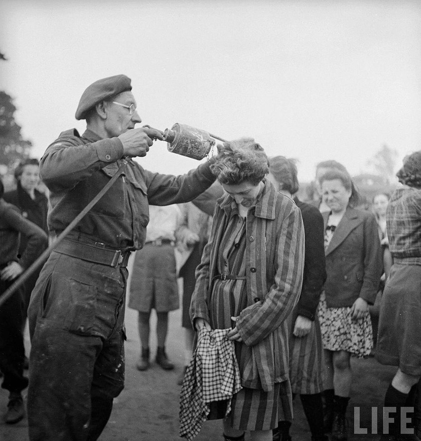 Британские врачи проводят полную дезинфекцию оставшихся в живых пленников лагеря смерти Берген-Бельзен.