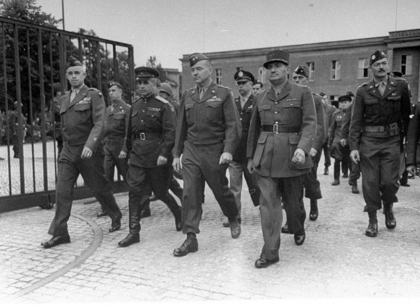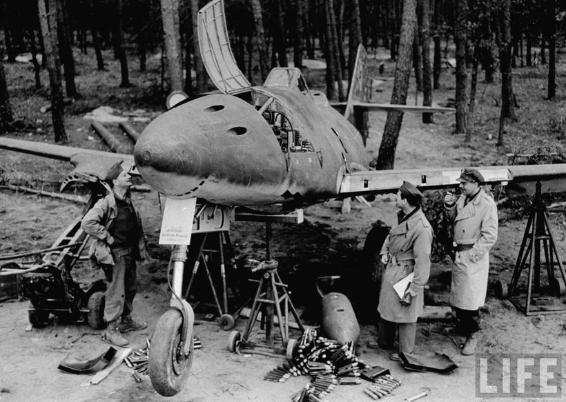 Армейские офицеры осматривают немецкий реактивный самолет, который был сбит на Франкфуртском аэродроме.