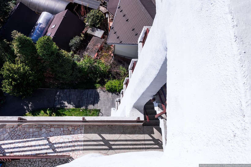 Пример площадки на центральной лестнице. Над ней расположены желоба для вагончиков канатной дороги.