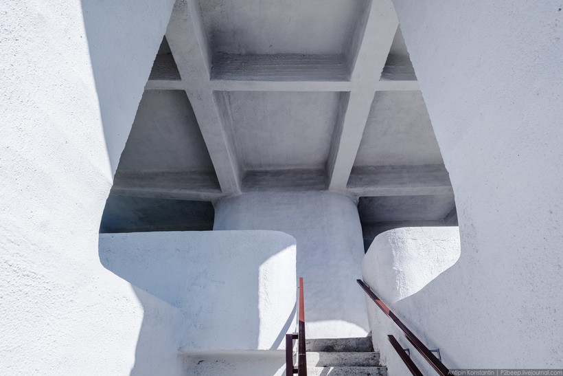 В башне есть две лестницы: узкая, но открытая — сбоку и широкая, имеющая меньший обзор — по центру.