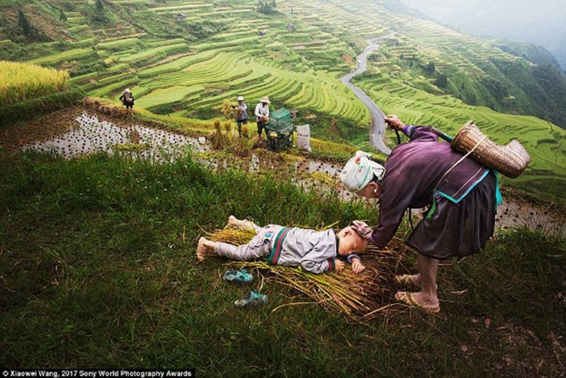 90-летняя китаянка присматривает за внуком, пока его родители работают в поле. Провинция Гуйчжоу, Китай