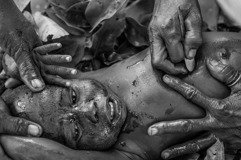 2-летний малыш проходит болезненный ритуал шрамирования. Бенин, Западная Африка