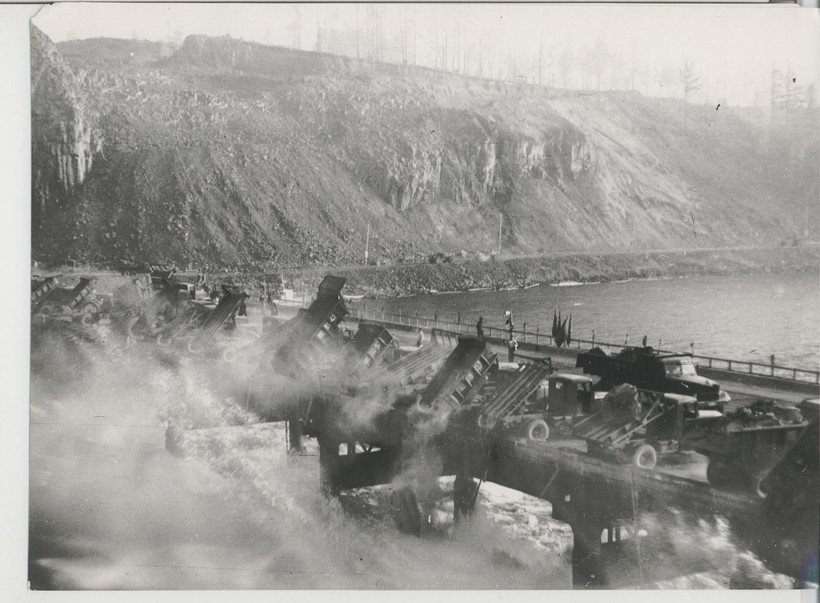В конце марта 1957 года была проведена грандиозная операция: правобережную часть Ангары перекрыли прямо со льда. Над операцией трудилось 220 самосвалов и 8 экскаваторов.