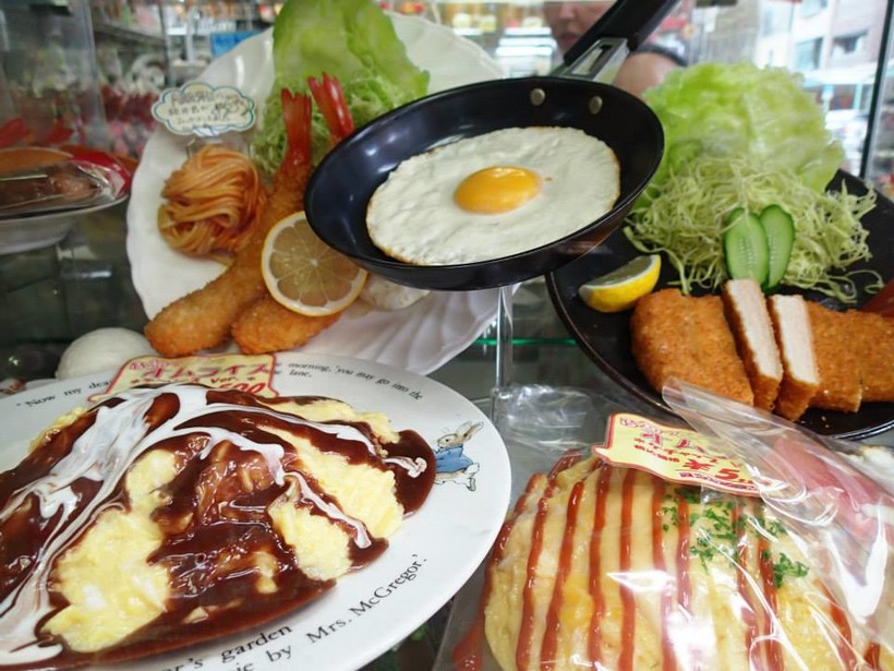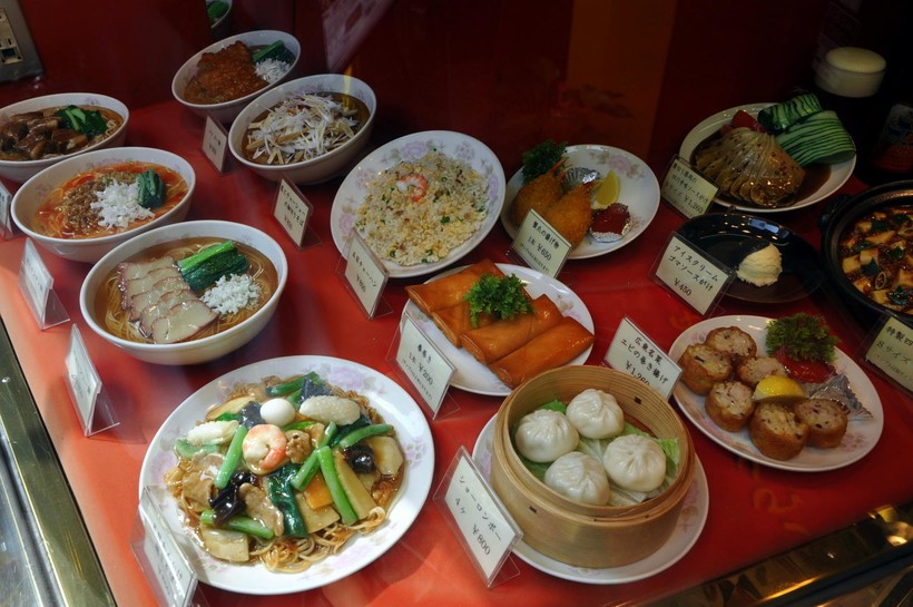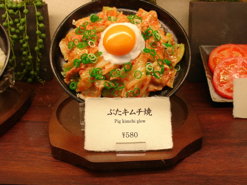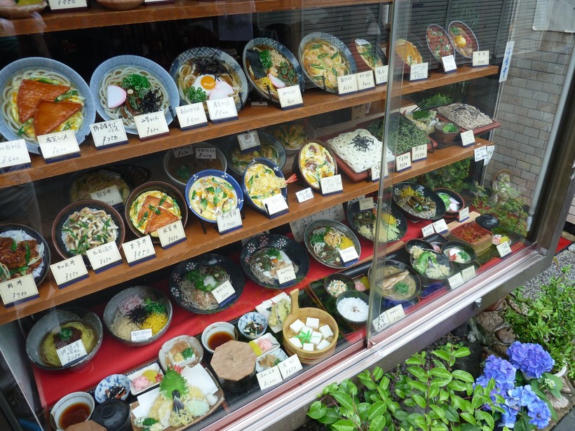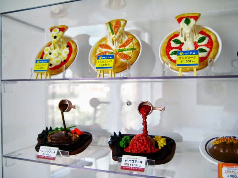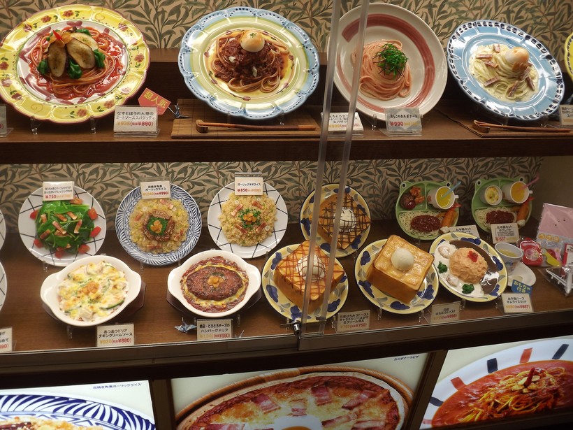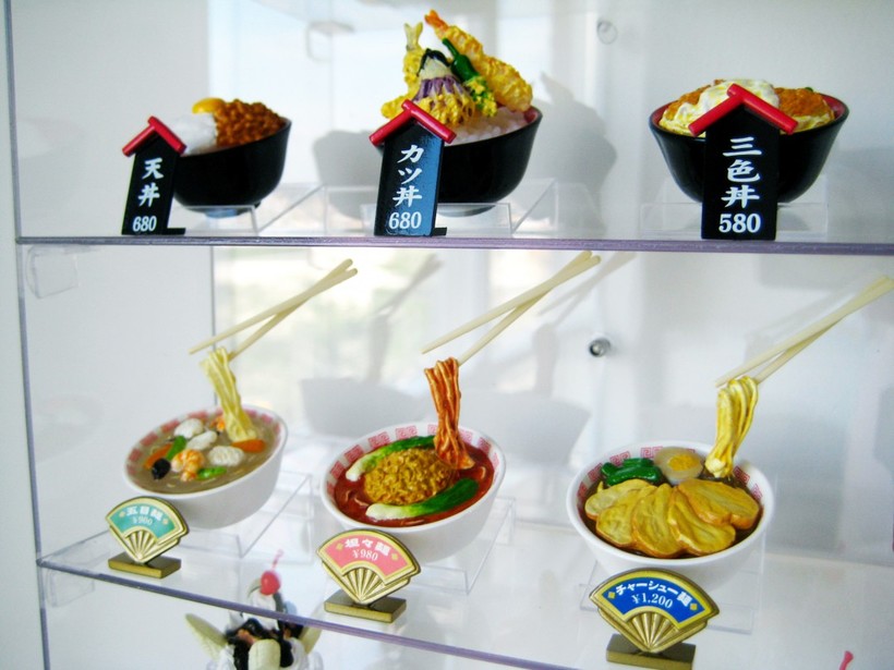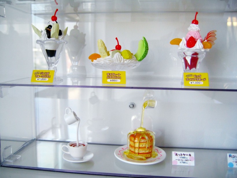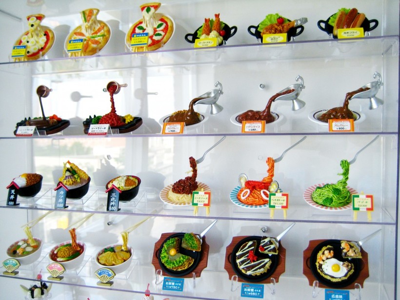 Японцы демонстрируют еду, так сказать, в 3D, реалистичным муляжом готового блюда. Яичная лапша с различными соусами, золотистая тэмпура, сладости, даже супчик изготавливаются вручную вместе с тарелочками и выставляются на витрину с ценником.