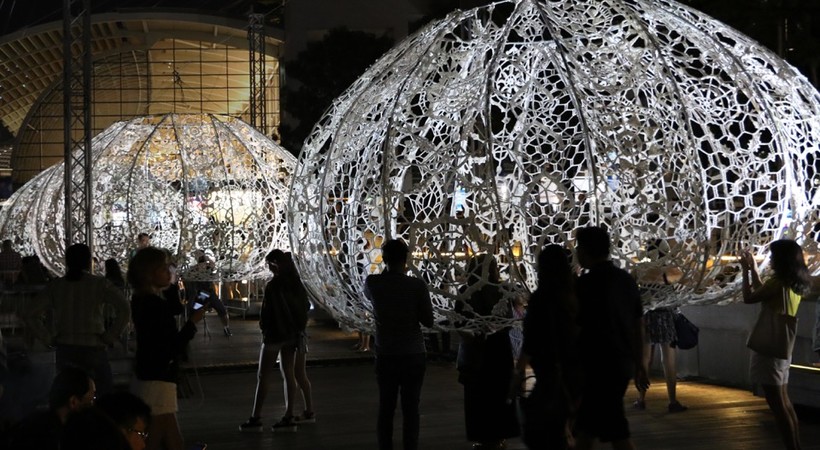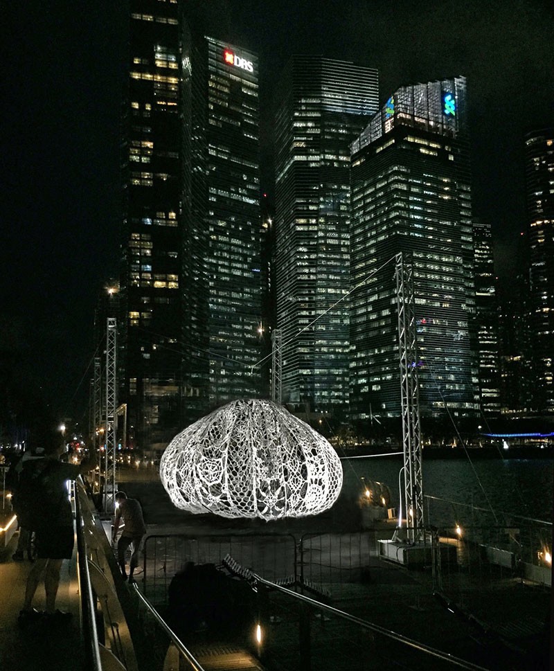 Команда из 50 человек провела два месяца, скручивая двойные плетеные полиэфирные нити, чтобы создать это трио светильников, которые взаимодействуют с естественным светом днем и светятся ночью. Каждый из них достигает около 17 м в окружности и почти 100 кг весом.