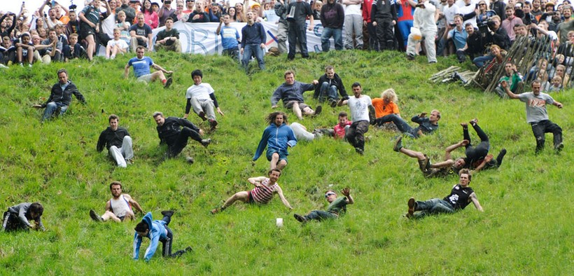 В этом году тоже не обошлось без травм: головка сыра катилась с горы со скоростью 112 километров в час, большинству участников попросту не удалось удержаться на ногах. Они кубарем летели по скользкому после дождя склону. Ну а победителем стал 29-летний Крис Андерсон, а в женской гонке — 18-летняя Киви Морган. Их наградили большими головками сыра.